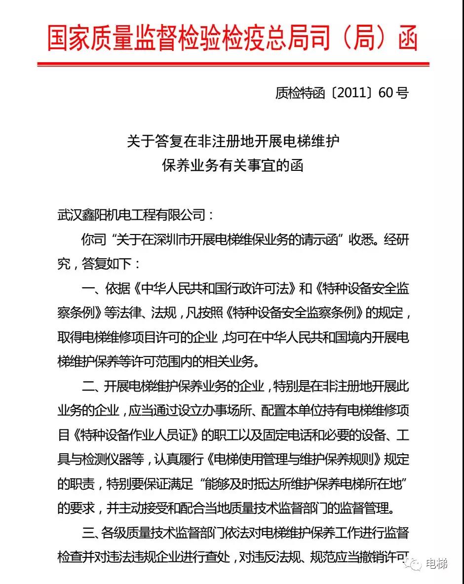 總局回復(fù):可查閱原質(zhì)檢總局特種設(shè)備局《關(guān)于答復(fù)在非注冊(cè)地開展電梯維護(hù)保養(yǎng)業(yè)務(wù)有關(guān)事宜的函》(質(zhì)檢特函〔2011〕60號(hào))或咨詢當(dāng)?shù)厥〖?jí)市場(chǎng)監(jiān)管部門。