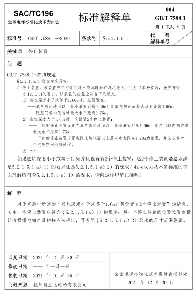 關(guān)于發(fā)布GB/T 7588.1—2020《電梯制造與安裝安全規(guī)范 第1部分:乘客電梯和載貨電梯》第23號(hào)解釋單的通知 全國(guó)電梯標(biāo)準(zhǔn)化技術(shù)委員會(huì)發(fā)布了GB/T 7588.1—2020《電梯制造與安裝安全規(guī)范 第1部分:乘客電梯和載貨電梯》第23號(hào)標(biāo)準(zhǔn)解釋單(在全國(guó)電梯標(biāo)準(zhǔn)化技術(shù)委員會(huì)官方網(wǎng)站“標(biāo)準(zhǔn)解釋單”欄目中可下載)。 2024年3月27日